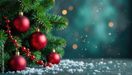 Festive Christmas scene with fir branches and red balls, ornaments, snowflakes