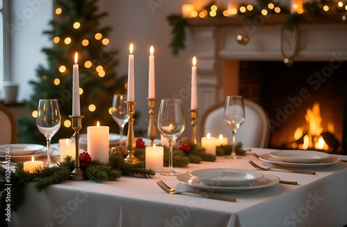 festive Christmas table decorated with New Year's decor, plates and glasses for the festive dinner