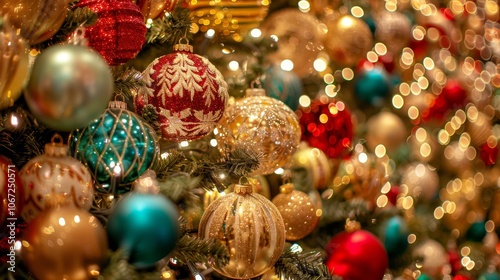 Festive christmas tree adorned with baubles and sparkling lights, ideal for holiday greetings