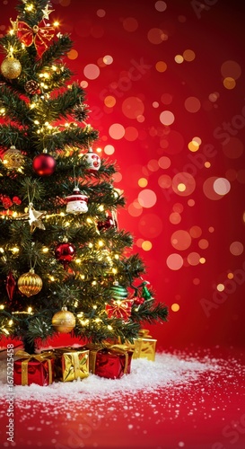 Festive Christmas tree adorned with sparkling ornaments and colorful baubles. Perfect for holiday décor, seasonal celebrations, and festive visuals.