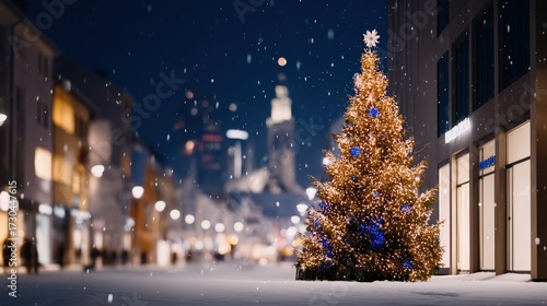 christmas tree, holiday season, winter landscape, city street, urban setting, celebration, decoration, illuminated, seasonal, december, cold weather, serene, enchanting, sparkle, glowing, magic, atmosphere, joyful, new year, traditional, holiday spirit, beautiful, wonderland, evening, bright, cheerful