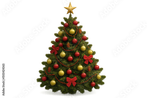 Festive Christmas tree, lush green with colorful ornaments and a star, perfect for holiday decorations and cheerful ambiance. Isolated on white background or PNG