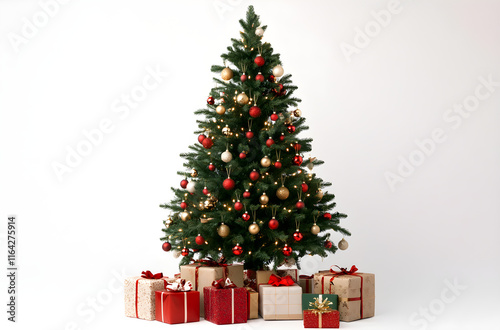 Festive Christmas Tree with Ornaments and Gift Boxes Isolated on White Background. AI generative.
