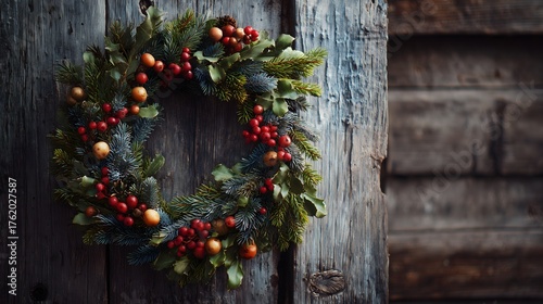Festive Christmas wreath on weathered wood for holiday cheer background