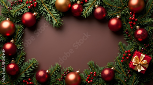 ornament, branch, gift, ribbon, berry, background, frame, chaplet, bauble, pine, needle, present, bow, foliage, border, circle, christmas, holiday, celebration, festive, winter, decoration, season, christmas, christmas, festivity, occasion, joyful, cheerful, warm, cosy, merry, happy, glad, spirited, bright, delightful, red, green, gold, brown, dark, crimson, emerald, amber, chocolate, decorative