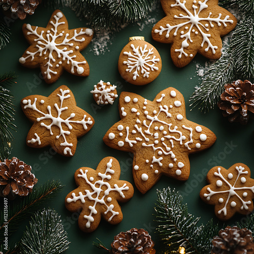 festive, holiday, sugar, cookie, icing, decoration, snowflake, ornament, closeup, green, background, pine, branch, pine cone, sweet, treat, dessert, homemade, baking, celebration, seasonal, epicure, edible, party, cheerful