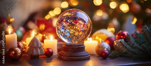 Festive crystal ball on a wooden stand illuminated by warm candlelight surrounded by colorful holiday decorations on a cozy bookshelf setting