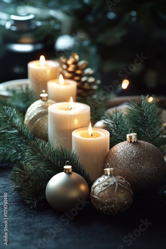 Festive display of white candles and gold ornaments, creating a warm holiday atmosphere.