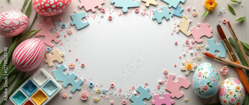 easter, spring, colourful, creativity, festive, celebration, family, happiness, puzzle pieces, decoration, vivid colors, art supply, flower, brush, design, fun, tradition, holiday, hobby, springtime, joy, nature, cheerful, texture, pattern, hand-made, sharing, gathering, playful, children, community, painting, egg, table, imagination, craft, color palette, enjoyment