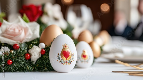 easter, egg, painted eggs, floral arrangement, flower, rose, white rose, red rose, christmas, winter, holiday, festive, celebration, table setting, elegant, luxury, gold, white, red, green, spring, design, pattern, detail, closeup, macro, photo, image, background, texture, still life, food, ornament, art, craft, handcraft, painted, beautiful, pretty, delicate, sophisticated, wedding, event, centrepiece