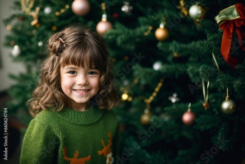 Festive Euphoria: A Girl in Green Pajamas Celebrating by the Christmas Tree