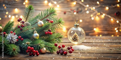 evergreen, bough, ornament, berry, shimmering, vibrant, red, gold, winter, festive, holiday, christmas, decoration, light, bokeh, snow, rustic, wood, background, pine cone, transparent, ball, arrangement