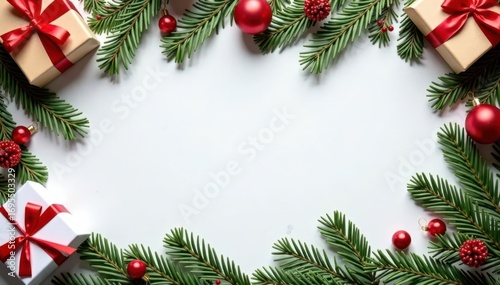 Festive fir branches, gifts, & Xmas decor on white marble Flat lay, top view, copy space , holiday background, gifts, winter