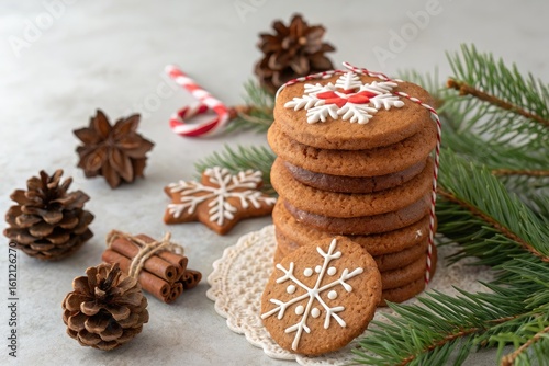 gingerbread, cookie, snowflake, decoration, pine, branch, holiday, festive, cinnamon, cone, sweet, dessert, winter, tradition, baking, treat, homemade, cosy, celebration, party, table, aroma, spice, treat, epicure, season, red, white, edible, art, culinary, pleasure, nostalgia, entertaining, family, gathering, warmth, holiday, seasonal, stack