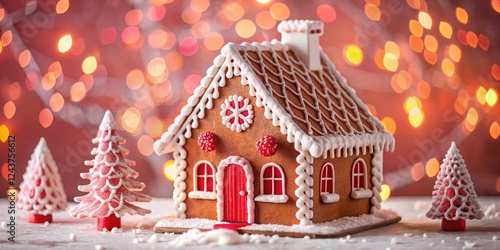 Festive Gingerbread House Red and White Decor, Bokeh Lights