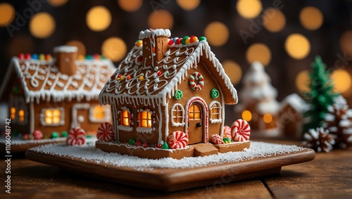 Festive gingerbread houses on a table with bokeh background.