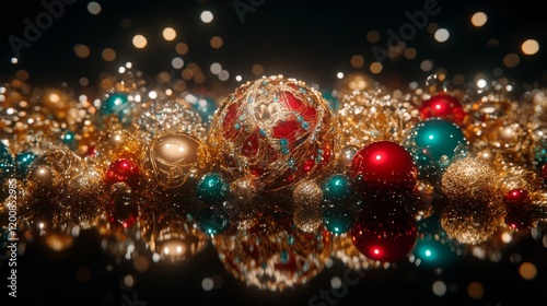 ornament, christmas, festive, bokeh, merry, light, sparkle, background, glimmering, ball, glistering, abstract, decor, macro, still life, design, celebration, season, shiny, texture, closeup, photo, glamour, red, gold, winter, bright, art, collection, elegance, holiday, cheer, green, visual, reflective, night, dark, happiness, luxury, joy