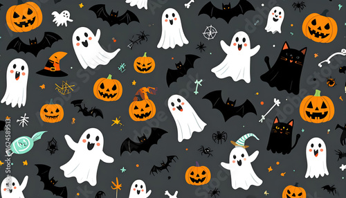 halloween, ghost, pumpkin, cat, bat, spider, spider's web, bone, candy, hat, sorcerer, monster, creature, character, animal, skittish, cute, friendly, pattern, seamless, background, texture, wallpaper, wrapping, paper, fabric, design, illustration, graphic, art, vector, digital, celebration, holiday, festival, party, autumn, fall, october, night, fun, playful, cheerful, happy, children, children, family