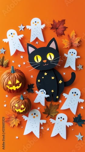 halloween, black cat, pumpkin, ghost, autumn leaf, orange background, decoration, playful, festive, skittish, star, seasonal, october, party, creepy, fun, celebration, cute, creative, bricolage, festivity, autumn, holiday, cheerful, colourful, whimsical, happy, gathering, eerie, joyful, tradition, decoration