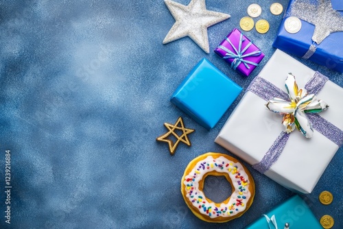 Festive Hanukkah Gift and Donut Display - Hanukkah celebration, gifts, donuts, stars, menorah, dreidel, joy, tradition. Sweet treats and festive presents symbolize the spirit of the holiday.