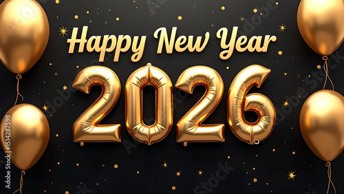 Festive Happy New Year 2026 Celebration with Golden Balloons and Glittering Stars