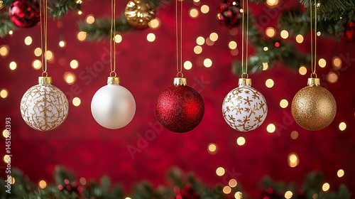 Festive holiday background with red, gold, and white Christmas baubles hanging with warm fairy lights
