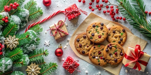 Festive Holiday Cookies and Gifts Surrounded by Evergreen Branches and Red Berries