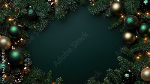 Festive holiday decoration with green foliage, ornaments, and warm lights set against a dark background