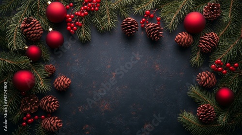 holiday, decoration, ornament, red, pine, branch, festive, winter, celebration, seasonal, accessory, nature, conifer, christmas, beauty, arrangement, dark, background, cone, berry, greenery, design, decor, tradition, joyful, ornamentation, colours, texture, indoor, aesthetic, spirit, craft, theme, shiny, cheer, season, table, creativity, natural, element, rustic, home, needle