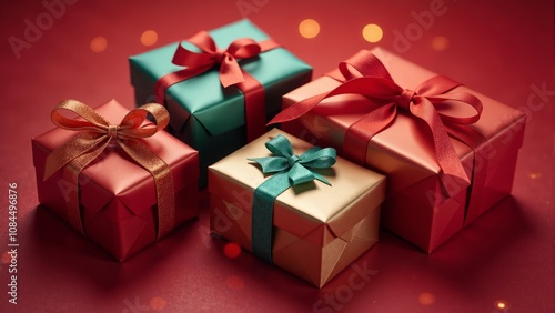 Festive holiday gifts wrapped in colorful paper with ribbons on a joyful red backdrop