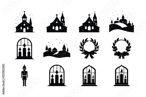 Festive Holiday Icons Featuring Churches, Wreaths, Candles, a Winter Village, and a Toy Soldier in a Minimalist Black and White Style