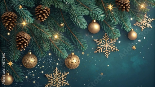 Festive Holiday Scene with Golden Baubles, Pinecones, and Snowflakes on Teal Background, Illuminated by Warm Bokeh Lights V3