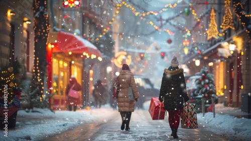 Festive Holiday Shopping During Christmas in Snowy Street with Lights and Decorations