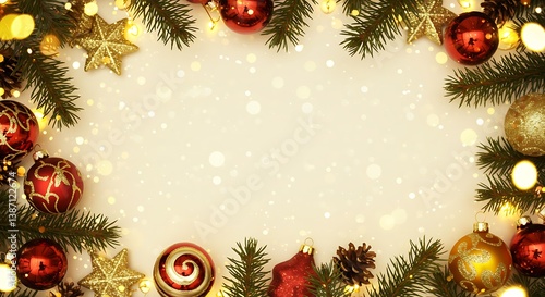 christmas, ornament, garland, red, gold, light, festive, holiday, background, frame, border, decoration, tree, branch, sparkle, glistering, pine, cone, star, ball, swirl, celebration, season, joy