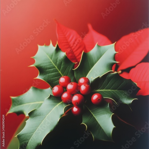 holly, berry, leaf, christmas, holiday, winter, nature, red, green, festive, seasonal, decoration, plant, evergreen, botanical, still life, vibrant, bright, background, colours, image, photo, stock, design, decor