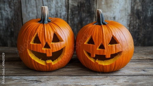 Festive Jack-o-Lanterns Displayed on Weathered Wood for Halloween