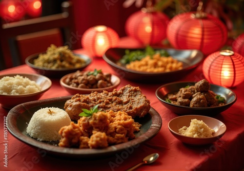 festive meal setup featuring a plate of Rendang with fragrant rice, Lunar New Year pastries, and traditional decorations like Chinese knots