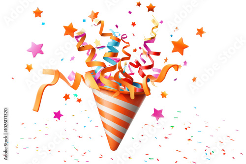 Festive party popper, A vibrant 3D party popper exploding with multicolored streamers and stars, isolated on a transparent background. Perfect for celebration and festive event graphics. PNG, File