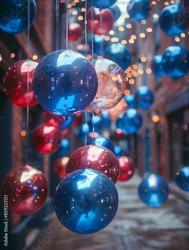 holiday, festive, patriotic, party, event, festivity, lighting, ball, ornament, globe, hanging, pendant, red, white, blue, overhead, string, cascade, cheer, atmosphere, national, bright, colourful, sparkle, glowing, reflect, mood, vibrant, cheerful, joyful