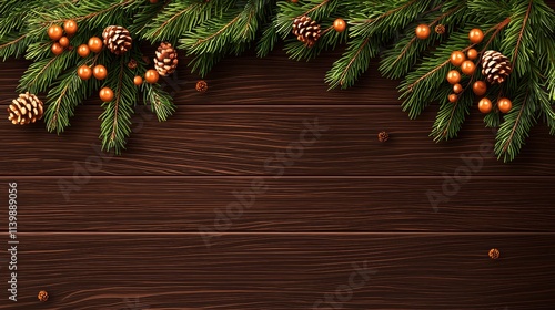 Festive Pine Branches with Pinecones and Ornaments on Rustic Wood