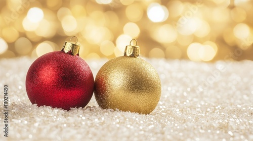 Festive Red and Gold Christmas Ornaments on Glittering Snowy Background for Holiday Celebrations and New Year Wishes