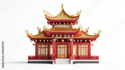 temple, chinese, red, pagoda, architecture, building, three-dimensional, render, isolated, white, gold, detail, ornate, festive, celebration, culture, asian, traditional, design, model, structure, decoration, roof, element, background, scene, holiday