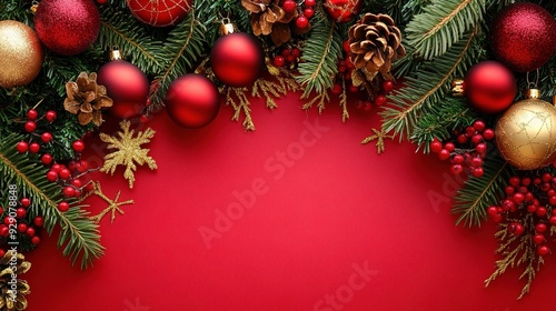 Festive Red Christmas Border: A festive Christmas border with red and gold ornaments, pine branches, and pine cones on a red background.