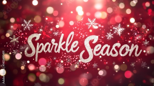 Festive red glittering holiday background with sparkle season text and snowflakes