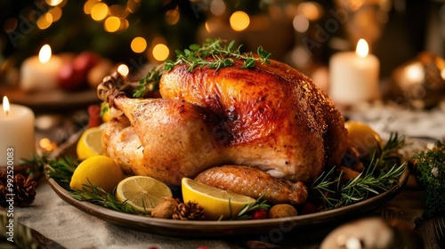 turkey, roast, festive, herb, citrous, dinner, meal, platter, holiday, celebration, cooking, food, feast, table, delicious, savoury, seasonal, garnish, cookery, preparation, warmth, dining, arrangement, family, inviting, natural, traditional, atmosphere, elegant, epicure, thanksgiving, serving, side, ingredient, fresh, brown, cooked, nature, comfort, rustic, ambience, roasted