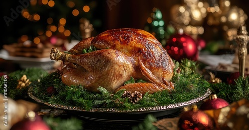 Festive Roast Turkey with Holiday Decorations. AI generated illustration.