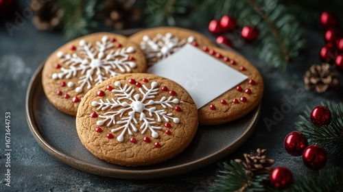Festive, round, decorated cookies, snowflake design, red accents, blank card
