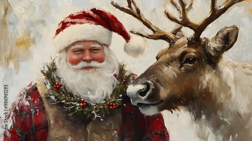 santa, christmas, reindeer, holiday, winter, tradition, red, white, beard, hat, holly, garland, nature, animal, costume, festive, joy, cosy, season, gift, cheer, snowy, evergreen, cervid, jolly, merry, folklore, mythical, mammal, mammalian
