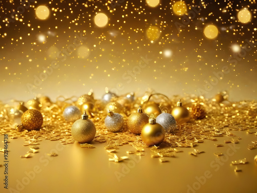 festive scene featuring golden and silver Christmas ornaments scattered across a glittery gold surface. The background is also gold with bokeh lights creating a warm, celebratory atmosphere