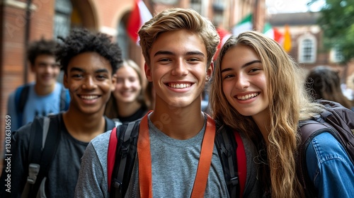 Festive scene of international education day celebration students of various backgrounds holding hands raising flags and sharing smiles offering a sense of unity and global learning